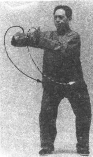 ③ H0H0随着上体微向右 转,身体重心暗暗向右腿偏 移。同时左手顺缠、右手逆 缠,在两肘的牵动下沿顺时 针的上弧线向右前方捋带, 右手手心朝前下方,指尖朝 左前方;左手手心朝右,指尖 朝前上方:两眼的视线先随 两手动作平移,而后注视右 手。(图三9)