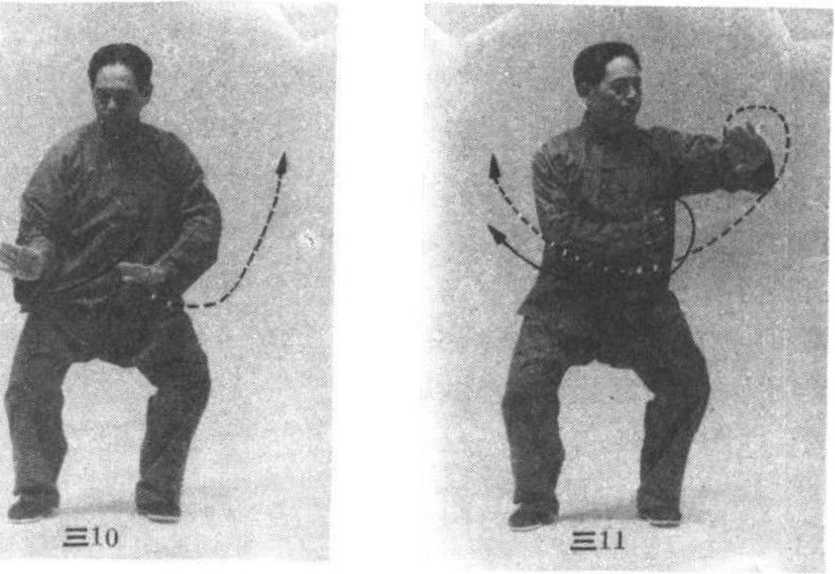 身体重心下降,右手顺缠、 左手逆缠,同时向右、向下沿顺时针的右弧线绕转沉落呈 下探之势,随后经腹前继续沿下弧线向左前方徐徐地挤 按而出,左手高与胸齐,手心朝左下方,指尖朝右上方; 右臂屈肘环绕于胸前,肘肋不要相贴,其间适当地留有余 隙,右手手心朝左,指尖朝前;两眼的视线先随两手的动 作自上而下地移动;在两手向左前方挤按时举目平视左 前方。(图三10、II)