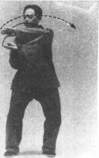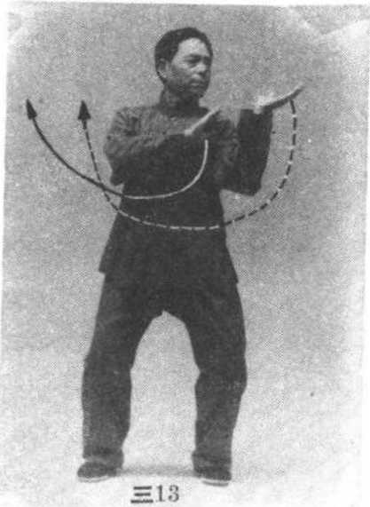 ⑤ =12=12上体微微左转,同 时左手顺缠、右手逆缠经面 前向左划弧,两肘尖向下垂 坠,左手手心朝上,指尖朝左 上方;右手手心朝下,指尖亦 朝左上方;头略向左转,眼看 左手指尖。(图三13)