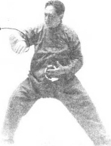 ① 随着身体微微左转,上体含胸收腹,重心略向上 提;两肩、肘、腕逐节放松,左手指尖贴腹沿顺时针方向 绕一小立圆,右手亦沿顺时针轨迹绕一小圆形,身体随着 右手的缠绕微向右转;视线随着右手的绕转而移动。(图 三 38、 39)