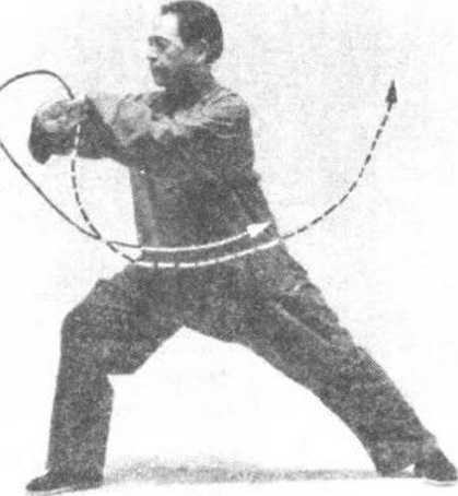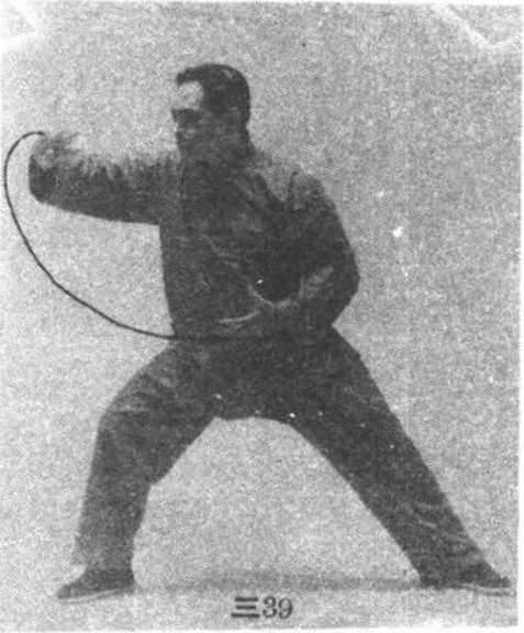 ?周身向下松沉,随 着松肩坠肘,右手经上向右 顺缠,绕一小半圆形,沉腕侧 立于身体右前方,眼看右手 指尖。(图三37)