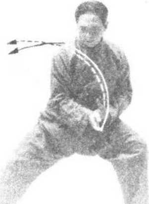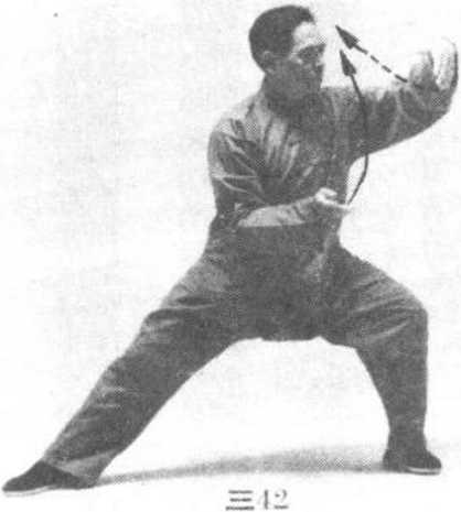 ④ 两手微向前上方搠 起,身体微微向下松沉蓄劲, 随即双手顺缠沿弧形路线经 下向左上方绕转,身体随之 左转,左腿渐渐弓屈,右腿缓 缓伸展;头随身转,视线随左 手的动作移动。(图三42)