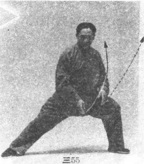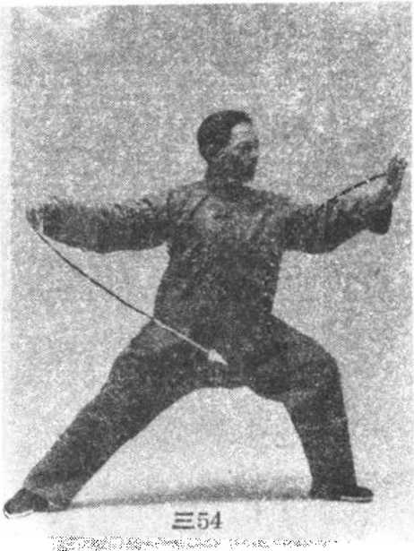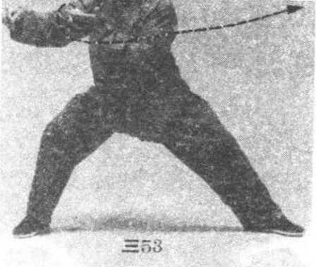 ⑧ 左手在胸腹前沿逆 时针轨迹顺缠一圈穿向右肩 前,两臂相合,手心转朝上, 指尖朝右前方;同时身体右 转,重心向右偏移渐成右弓 步,眼看右前下方。(图三 53)