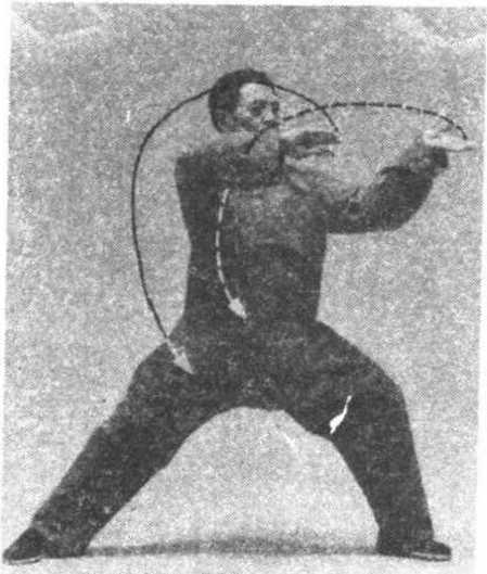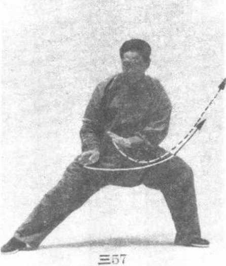 ③ 身体隐隐后倚并向 下沉劲,带动着两手左逆右 顺缠,沿孤形路线向右后下 方旋转捋带,左手手心朝右 前下方,指尖朝右前上方;右 手手心朝左前方,指尖朝右 前方;眼看右前下方。(图三 57)