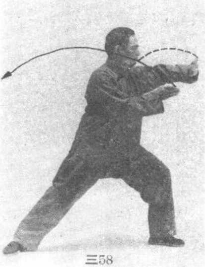 ④ ③ 身体隐隐后倚并向 下沉劲,带动着两手左逆右 顺缠,沿孤形路线向右后下 方旋转捋带,左手手心朝右 前下方,指尖朝右前上方;右 手手心朝左前方,指尖朝右 前方;眼看右前下方。(图三 57)③ 身体隐隐后倚并向 下沉劲,带动着两手左逆右 顺缠,沿孤形路线向右后下 方旋转捋带,左手手心朝右 前下方,指尖朝右前上方;右 手手心朝左前方,指尖朝右 前方;眼看右前下方。(图三 57)随着身体微左转, 重心略向前移,两手继续沿 圆形路线向左前上方提升, 左臂撑圆,左手手心朝前,指 尖朝左s右臂屈肘环护于胸 前,右手手心朝前,指尖朝 左3眼看左掌。(图三58)