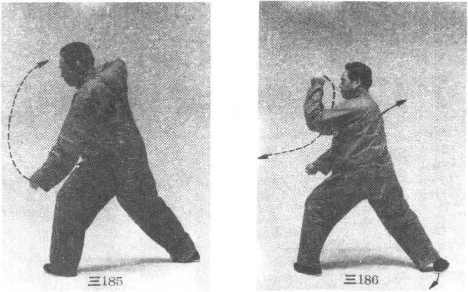 上方,拳心朝内,拳面朝下;眼看前下方。(图三185)