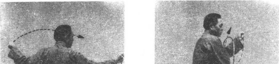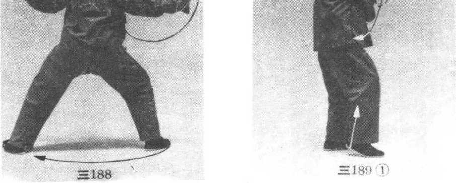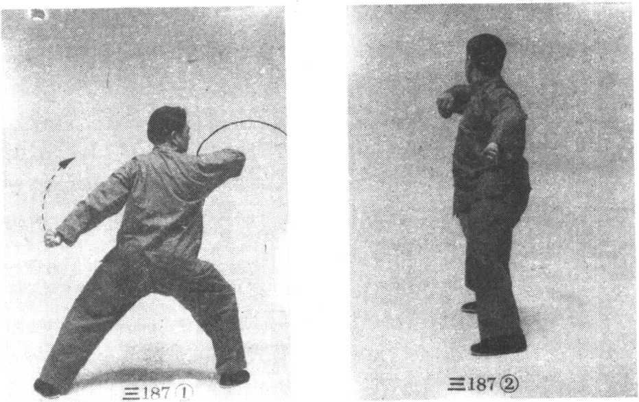 ④ 右拳逆缠沿顺时针的上弧线向右划弧;左拳顺 缠上抬,两拳拳眼皆朝上。(图三188)