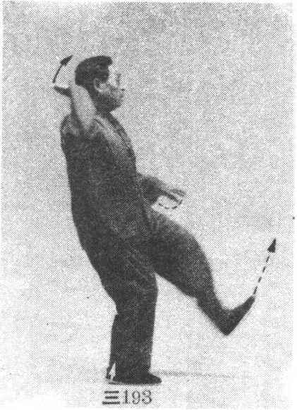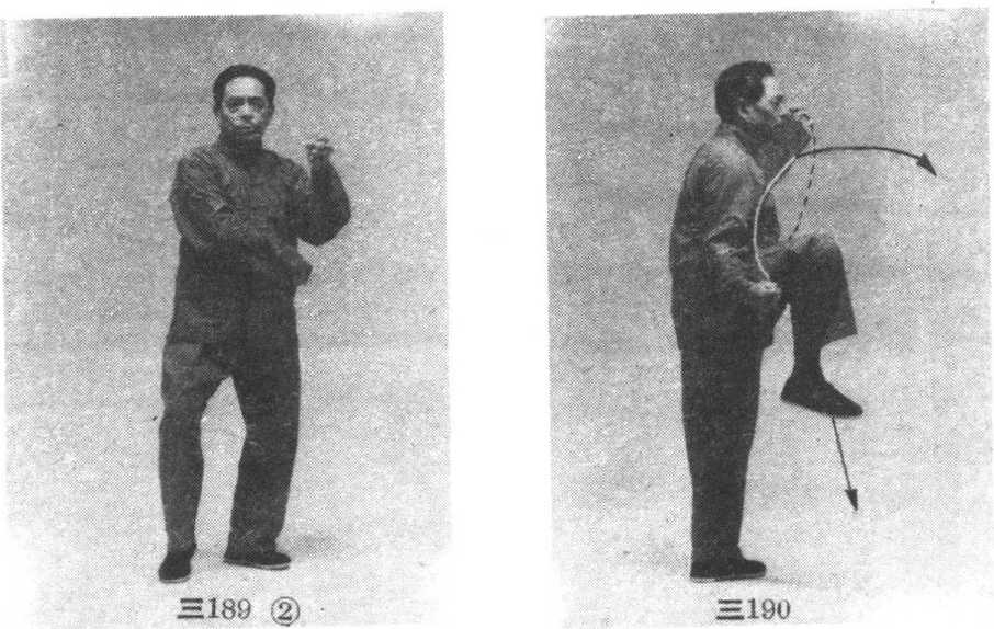 ⑥ 右腿屈膝上提,右脚不勾不绷自然悬垂;右臂外 旋,右拳顺缠经左臂弯内侧沿顺时针轨迹向上、向右弧形 翻砸下落,拳心朝左上方,拳眼朝右上方;左拳顺缠沿顺 时针的下弧线向左上方绕一半圆形至头部左前方,拳心 朝右,拳面朝上;眼看前方。(图三190)