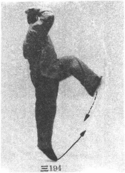 ⑧ 重心全部移至右腿,左腿微屈向前上摆动;左手 向前弧形下落至左胯前,右手向后、向上抡摆至右耳侧, 手心朝前上方,指尖朝后上方;眼看前方。(图三193)