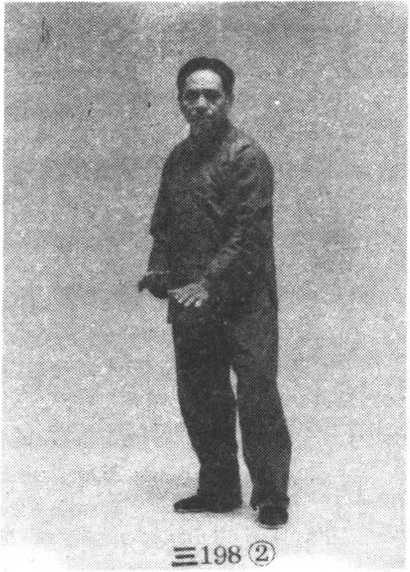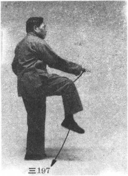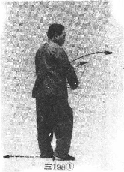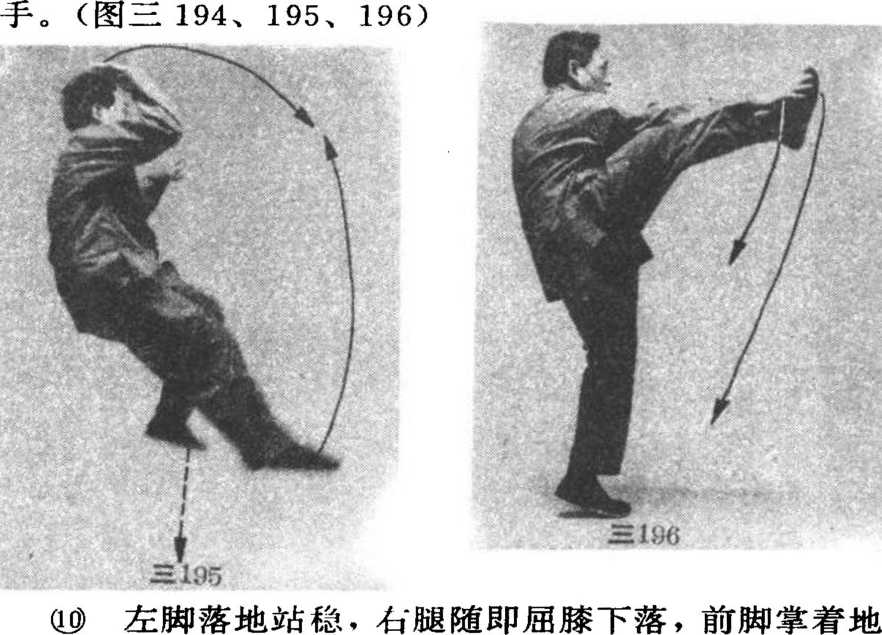 ⑨ 右腿猛然挺直蹬地跳起,身体在空中含胸收腹, 右腿向前上方踢摆,脚面绷平,同时右臂伸直,右手弧形 向前下抡拍右脚脚面,左手自然地向左上方摆动;眼看右.落于左脚右前方;两手弧形下落呈八字形按于腹前,手心 朝下,指尖斜向前,眼看前下方。(图三197、198①②)要点:不要过于追求二起脚的腾起高度,蹬地起跳前 后均以不失轻灵、自然为要。起跳前要借两臂立圆抡绕和 左腿向前上摆动之势带动身体上提,上下肢动作要协调 配合。
