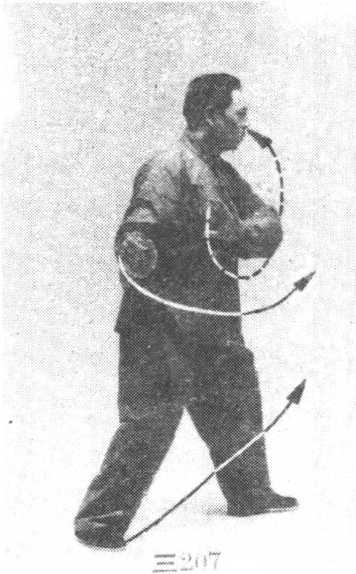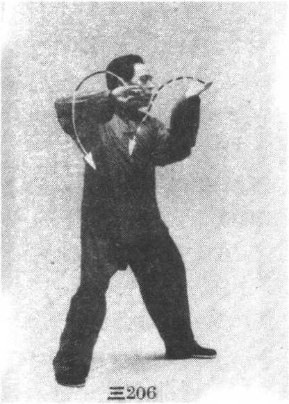 ② 腰微向右转,重心略向右偏移,右臂外旋,左臂 内旋,两拳左顺右逆缠渐渐变掌继续沿顺时针的上弧线 向右绕转,再左逆右顺缠绕至右下方,两手手心朝右前 方,指尖朝右上方;眼看前方。(图三206、207)
