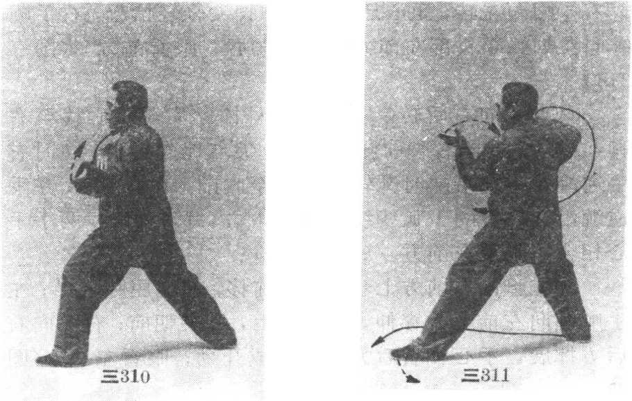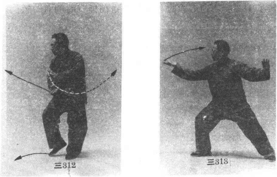 ② 腰向右转,重心向右腿偏移,右腿前弓,左腿略后 蹬,两手左逆右顺缠,继续沿顺时针的上弧线向右运行至 右前上方,手指高与肩平,左手心朝右,右手心朝右下方; 眼看左前方。(图三311)