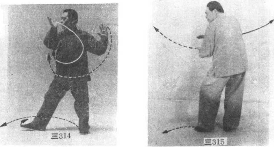 ⑤ 腰向左转,重心后移,右脚脚尖轻轻抬起,右手顺 缠向左划弧至头部左前方,左臂稍屈;眼看前方。(图三 314)