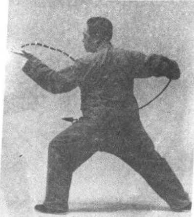 要点:两手依圆绕转要随旋腰转体而行,两脚交替上 步时落地要轻而稳。此式身体先向左转了 90度,又向右 转了 180度,到定式时与上式“指裆捶”的朝向一致。