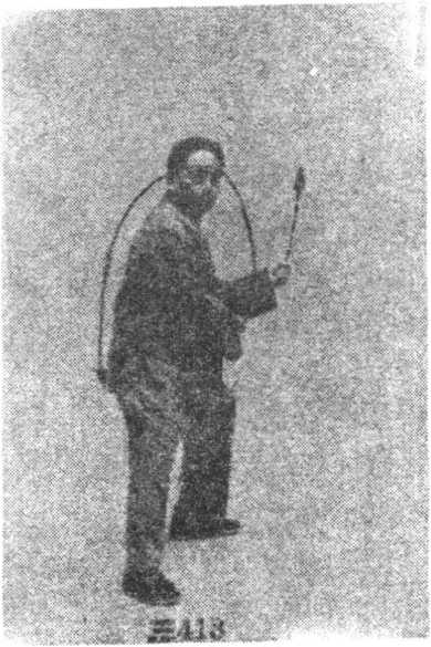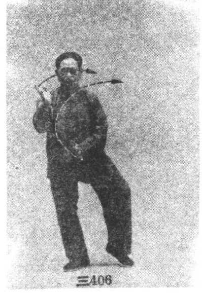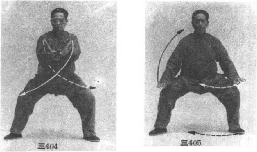 扣,两腿屈蹲成马步,同时两手顺缠收至胸前,右手在外, 指尖朝上;眼看前下方。(图三404) ?