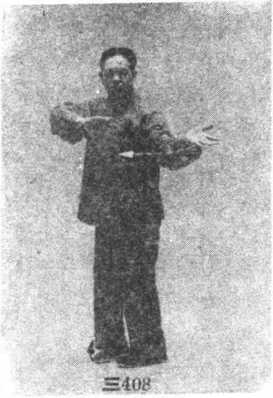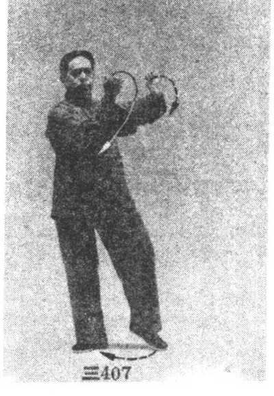 ③ 身体右转,左腿内旋,左脚脚尖内扣落于右脚前; 左手顺缠沿逆时针轨迹绕一小立圆,手心朝前上方,指尖 朝左;右手逆缠沿逆时针的左弧线绕至左胸前,手心朝 T;眼看左手。(图三408)