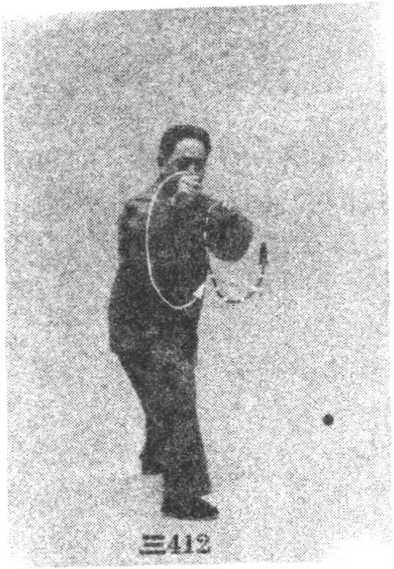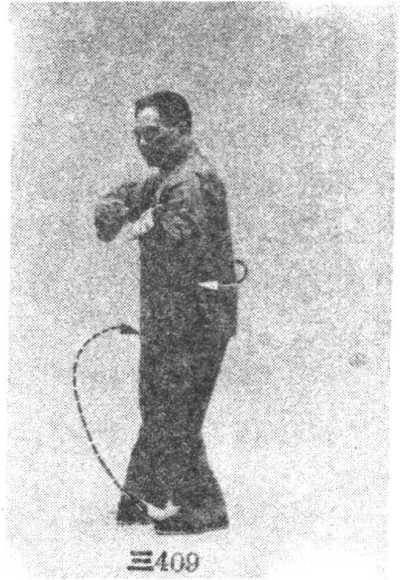 腰转在身前沿顺时针的右弧线向左绕行,右拳收至腹前, 拳心朝里,拳眼朝上,左拳顺缠引向后上方,拳心朝右上 方,拳眼朝左上方。(图三412、413)