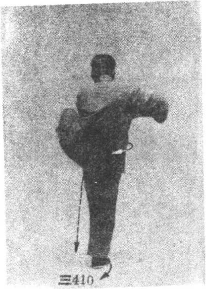 ⑤ 身体继续右转,重心移至右腿,随着左腿抬起向 上、向右抡摆,然后屈膝,左脚不勾不绷,自然地收提于 右腿前方,两手随转体平向右移,右臂略屈,圆撑于身体 右侧,手心仍朝下;左臂于胸前屈肘,左手手心朝上;眼 看前方。(图三410)