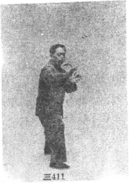 ⑥ 左脚脚尖内扣向前落地,身体随即右转;两手随体 转缓缓向右伸展,两手手心斜相对;眼看右手。(图三 411)