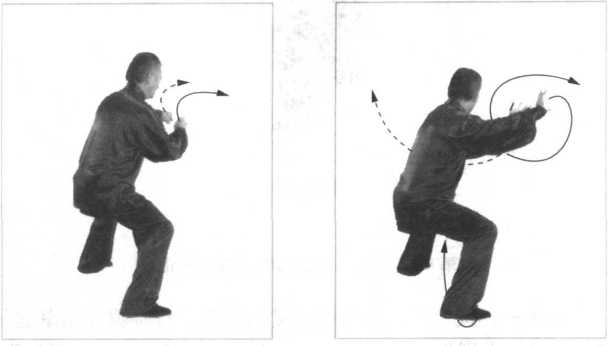 同时,松右胯、泛左臀,双胯挣衡前卷里合,开膝合膑,双 腿里缠,十趾抓地,裆部撑圆,借助旋踝转腿之劲,下弧调裆, 重心随势向左一移,乘胯部的转关过节,改为上弧调裆,重心移 回右腿,六四分成。
