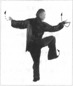 同时,松左胯、泛右臀,双胯挣衡前卷里合,开膝合膑,双 腿里缠,十趾抓地,裆部撑圆,借助旋踝转腿之劲,下弧调裆, 重心继续向右一移即松,借助胯部的转关过节,后下弧调裆,重 心移于左腿。小腹关元、中 极二穴共同收敛纳气,冲震 命门,引导右足人劲,画下 弧以膝盖领劲提于腹前,高 与胯平,小腿松垂直竖,五 趾微收,涌泉穴虚含吸地气 之意。腰劲顺左腿内侧向下 松串,注入脚底植地生根。