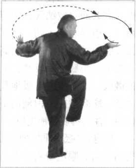 左手先出后人劲变为逆缠,折腕旋转,借助旋腕转膀之劲, 画下弧运展至身体左前方一松,乘肩部的转关过节,由拳变掌顺 缠,画上弧运展至身体前约45厘米,气聚轴腕,上搠下折,肘 向里合,高与眼平,手指松直向左上方,掌心向右上方;右手先 入后出劲变为顺缠,折腕旋转,借助旋腕转膀之劲,画下弧微微 向左一松,乘肩部的转关过节,由拳变掌逆缠,画上弧运展至身 体右侧前上方,气聚轴腕,内折外搠,腕由折变坐,肘微里合,