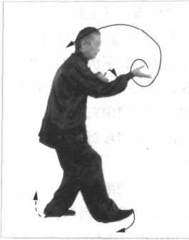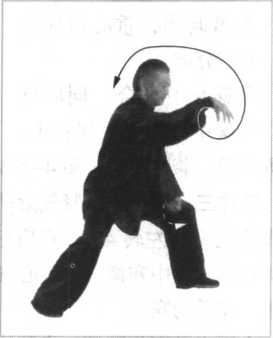 后出劲,画内上弧经左腿内 侧运至左脚前约30厘米,脚 尖上翘,脚跟虚点地面,双 脚跟对准在一条直线上,随 松胯、泛臀、收腹、扣裆, 重心偏于左腿,八二分成。