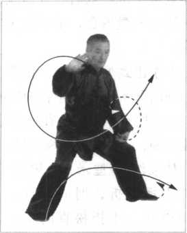 同时,松左胯、泛右臀, 双胯挣衡前卷里合,开膝合 膑,双腿里缠,十趾抓地, 裆部撑圆,借助旋踝转腿之 劲,上弧调裆,重心微向右 移,七三分成。