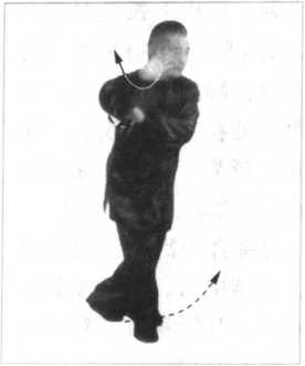 图 4-278图 4-278同时,松右胯、泛左臀,双胯挣衡前卷里合,开膝合膑,双 腿里缠,五趾抓地,裆部撑 圆,借助旋踝转腿之劲,下 弧调裆,重心移于左腿,以 左脚跟支撑地面,脚尖摆正 向前,微向上翘,重心左六 右四分成。