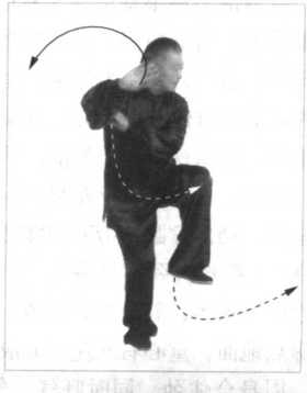 同时,松右胯、泛左臀,双胯挣衡前卷里合,开膝合膑,双 腿里缠,十趾抓地,裆部撑圆,借助旋踝转腿之劲,背丝扣调 裆,重心移于右腿,小腹内收,关元与中极二穴向内纳气,冲震 命门。乘左腿将被引虚之机, 借助胯部的转关过节和左足拇 趾领劲,左足人劲,画下弧旋 膝提起,高与胯平,小腿放松 垂竖,脚底平整,五趾微收, 涌泉穴含有吸地气之意。腰劲 顺右腿向下松串,注入脚底植 地生根。
