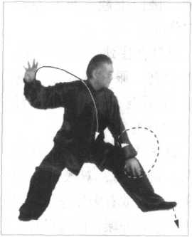 同时,松左胯、泛右臀, 双胯挣衡前卷里合,开膝合 膑,双腿里缠,五趾抓地, 裆部撑圆,借助旋踝转腿之 劲,引导左足出劲,画下弧 向身体左前方出腿,脚尖上 翘里合,脚跟内侧铲地而出, 重心仍偏于右腿,六四分成。