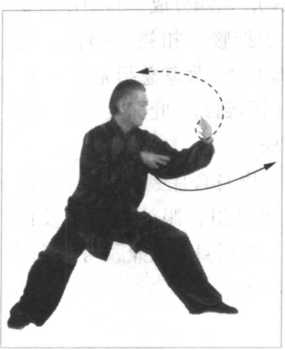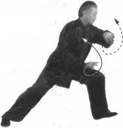 手指松直向前偏下,掌心向前偏下;右手人劲变为顺缠,坐腕旋 转,借助旋腕转膀之劲,屈肘翻掌画上弧经右耳旁时,乘肩部的 转关过节,变为逆缠,利用采按之法运合至身体前约15厘米, 气聚轴腕,上折下搠,肘微里合,高与小腹(中极穴)平,手指 松直向前,掌心向下。
