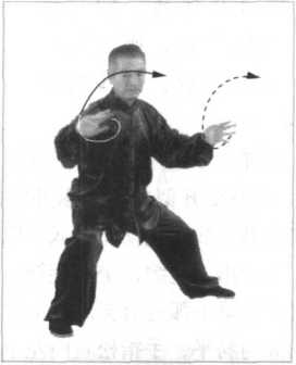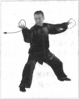 动作六:接上势。腰劲向左旋套,身体微螺旋上升。双肩松 开似脱,下塌外碾,内卷里合,右催左领,胸腰由右向左做上弧 运化动作,膻中穴微内含,牵动往来气贴背。双手以左手为主, 右手为宾。