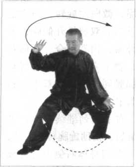 同时,松左胯、泛右 臀,双胯挣衡前卷里合,开 膝合膑,双腿里缠,十趾抓 地,裆劲撑圆,借助旋踝转 腿之劲,下弧调裆,重心继 续右移,七三分成。