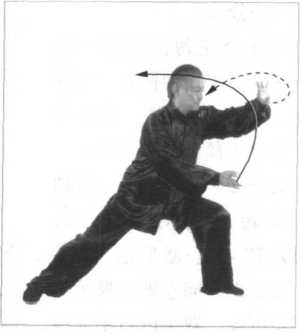 右手出劲变为逆缠,坐腕旋转,借助旋腕转膀之劲,画上弧 忽然一抖即松,运展至身体右侧上方,气聚轴腕,外搠内折,肘 微里合,高与眼平,手指松直向上偏左,掌心向右上方;左手入