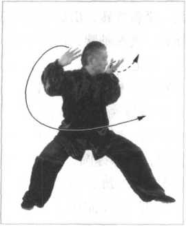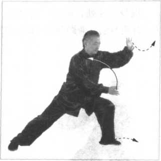 同时,松右胯、泛左 臀,双胯挣衡前卷里合, 开膝合膑,双腿里缠,十 趾抓地,裆部撑圆,借助 旋踝转腿之劲,下弧调 裆,双足及时前蹬、后 把,劲要一吐即收,形成 一抖即松,重心移于左 腿,六四分成。腰劲向下 松串,注入脚底以助脚底 之劲上翻传导。