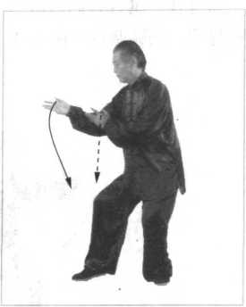 双手出劲变为双逆缠,翻掌坐腕旋转,借助旋腕转膀之劲, 画下弧利用采按劲,向下忽然一抖即松,分别运展至身体前左手 约20厘米与右手约45厘米,气聚轴腕,上折下搠,肘向里合, 高与腹脐平,手指松直向前,掌心向下。