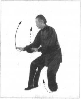 同时,松右胯、泛左 臀,双胯挣衡前卷里合,开 膝合膑,双腿里缠,十趾抓 地,裆部撑圆,借助旋踝转 腿之劲,前裆扣合,后裆撑 开,重心不变。腰劲向下松 串,注入脚底,以助脚底之 劲上翻传导。