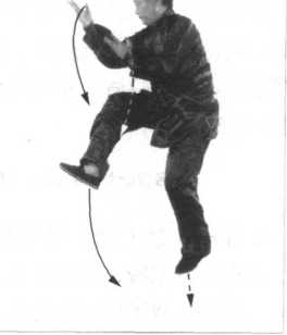 同时,松右胯、泛左臀,双 胯挣衡前卷里合,开膝合膑,双 腿里缠,随身体与气机下落之 势,双脚左先右后相续落下,震 地双声,十趾及时抓地,裆劲前 合后开,重心偏于左腿,六四分 成。腰劲向下松串,注入脚底, 以助脚底之劲上翻传导。