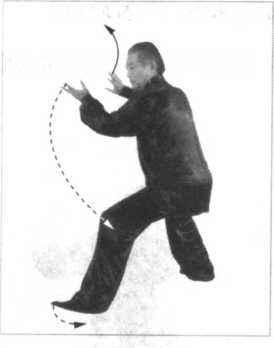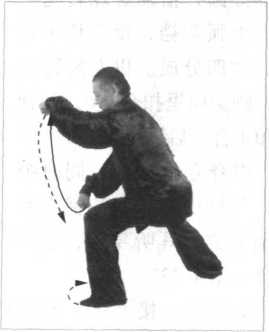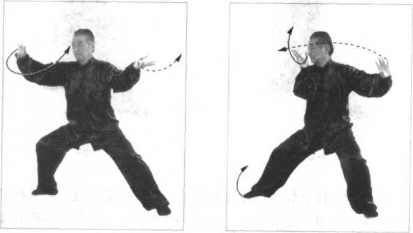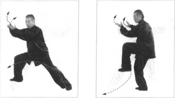 同时,松右胯、泛左臀, 双胯挣衡前卷里合,开膝合 膑,双腿里缠,五趾抓地, 借助旋踝转腿之劲,下弧调 裆,重心移于左腿,六四分 成。