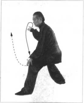 劲,屈肘画上弧经右耳旁过胸前向左膝内侧运展下击,气聚轴 腕,内折外搠,肘向里合,高与膝平,拳面向下偏前,拳眼向 左,拳心向内(后);左手人劲继续逆缠,折腕旋转,借助旋腕 转膀之劲,画下弧运展至身体左前上方,气聚轴腕,下折上搠, 肘向里合,高与眼平,拳面 向前下方,拳眼向右,拳心 向下。