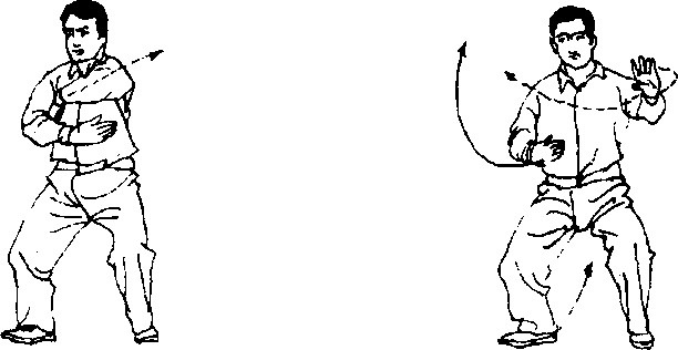 ① 此势在开始时应注重顺逆缠丝的大小。为使动作得势和 得劲,当右掌经左肘下时应紧缩圈径,这也是大小顺逆缠开始 形成的时候。在双开前要吸气,转为双开时要呼气,一直呼到 两手开至定点为止,这也是使此动作达到神气鼓荡的方法之