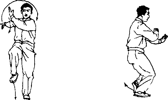 2. 晨脚发掌 重心移于左腿,身体左转,右脚提起脚