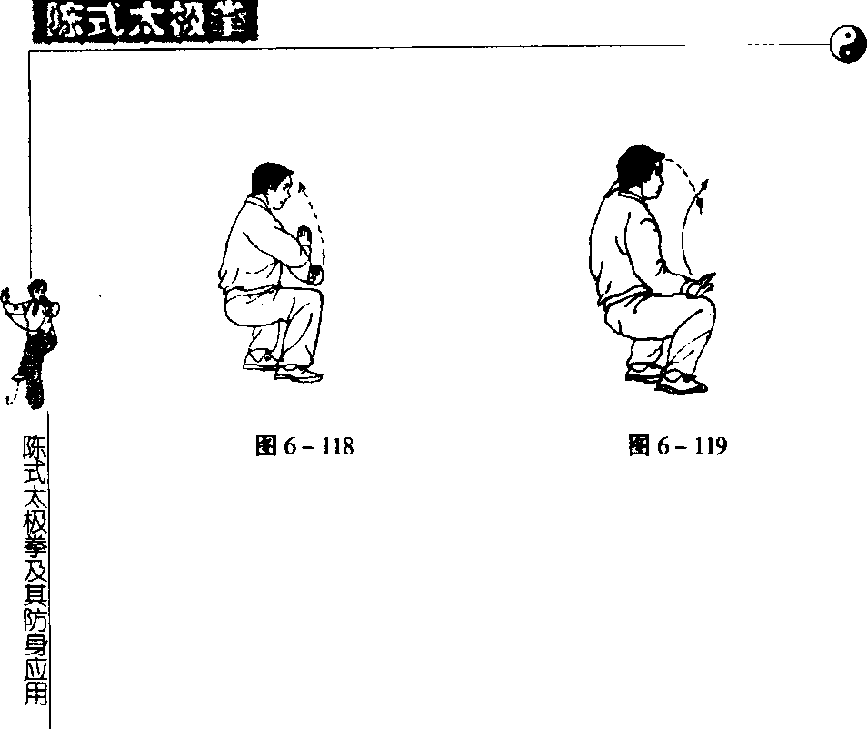③ 此势在身体中正下蹲时,裆口须宽。这样,就会使会阴 之气自然从尾闾上升,这是很有利的。但是,下蹲时裆口的高 度不得低于膝,以免形成荡裆.,如有荡裆,会使两脚外侧虚 浮,因而又使虚实变换产生了濡滞,所以同时也应避免腿部的
