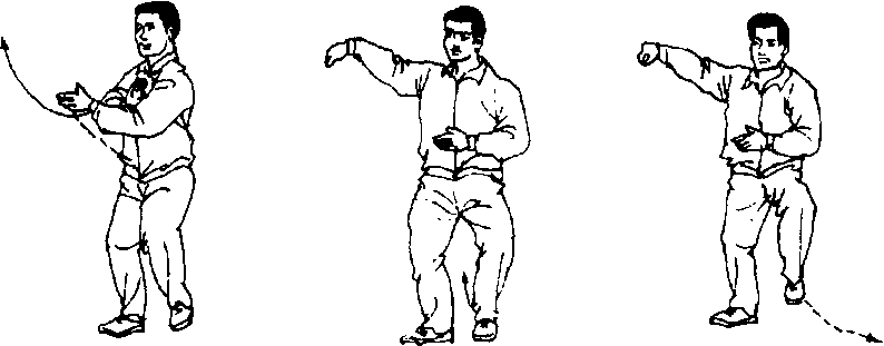 1 .转腰右挤 身微左转,重心微后移;同时两手先各 在原处旋臂划一小圈(以引起动作),即右手大顺缠转臂撅至 腹前,左手小逆缠搠至胸前,两手形成合劲。身微右转,重心 前移,左腿变实;同时,右手转臂顺缠、左掌小逆缠,两手合 住劲,向右上方弧形挤出。(图6-141. 6-142)