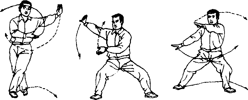 ① 此势须注意上下相随的虚实要求,检查一下是否明显地 把这要求表现了出来:就是某一手旋转到上搠为虚时,重心就 必须渐渐移到该手下面的腿上,此腿即变为实:一待上棚过后 转为下振,则此腿即须转变为虚,这样做,就将两手的虚实和 两足的虚实统一于整个上下虚实之中,形成处处总有一虚一实 (提腿独立、解脱擒拿时除外),达到了意气灵换的要求,产生 圆活如珠的趣味。
