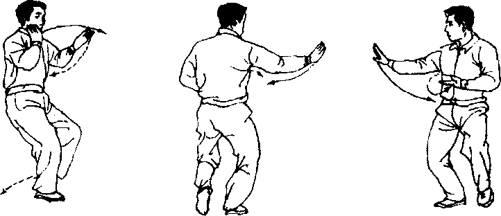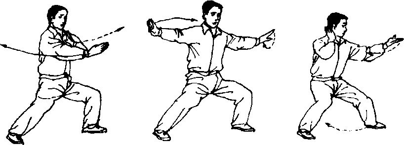 ④ 此势在右手前推高探时,须具有支撑八面之势。此势与 斜行拗步的不同点是,斜行拗步的右手经右耳旁是向左右分开 的;而此势是前后开中寓合的,并要求在缠丝线路中没有凹凸 和内劲中断的缺点。