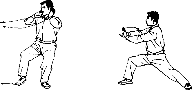 ③ 这种两掌前按的形式和内劲各有不同,已如上述。另 外,它在推山放劲的同时,还要以呼气(发出嘘音)来配合着 掌才艮下塌,一齐放出劲去,才使“推山”的推劲恰到好处。
