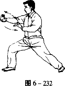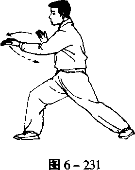 1 .转腰换掌 身体右转。同时,左手顺缠翻掌微前伸, 使掌心朝上;右手顺缠屈肘里收至左臂上侧。同时配合以左膝 内缠、右膝外缠。身微左转。同时,右掌顺缠向前转为逆缠, 横掌推出;左掌顺缠屈肘里收至胸前,掌心朝右上。同时配合 以右膝外缠,左膝内缠(完成第一次换掌)。(图6-231、6- 232)