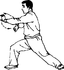 ③ 三换掌,第一次是用右掌推出,第二次用左掌推出,第 三次仍旧是右掌推出,它是在不换腿的情况下形成了三次转 换;转换时由于腰裆的变换和腿的缠丝旋转,使腰裆和腿部内 劲的虚实也随着转换三次,使之仍符合上下相随的要求;但一 条腿支撑全身较久,运动量就较大。此势不仅能提高锻炼效 果,也能提高技击的化劲技能。(这是陈发科老师的晚年杰作)